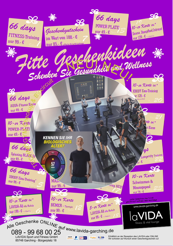 Bitte vereinbaren Sie vor dem 1. Besuch einen Starttermin unter https://www.mysports.com/studio/bGF2aWRhLWdhcmNoaW5nOjEyMTAwMTEzOTA%3D/appointment/1213176740 oder telefonisch unter 089-99 68 00 25